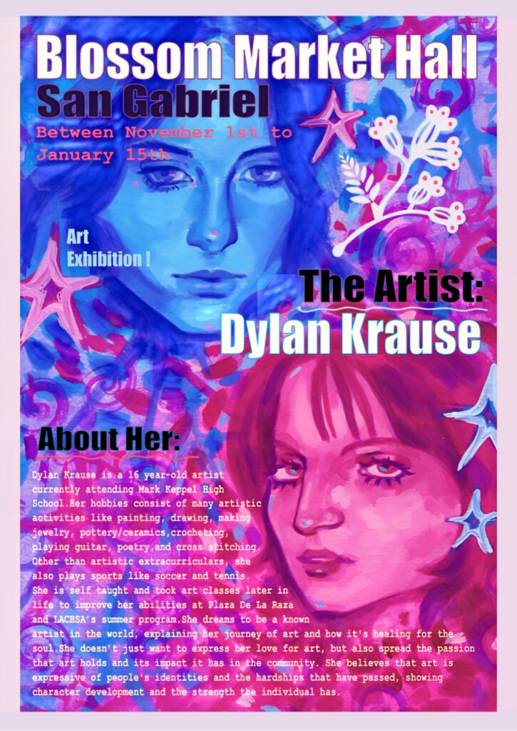 Dylan Krause is a 16 year old artist currently attending Mark Keppel High School. Her hobbies consist of many artistic activities like painting, drawing, making jewelry, pottery/ceramics, crocheting, playing guitar, poetry, and cross stitching. Other than artistic extracurriculars, she also plays sports like soccer and tennis. She is self taught and took art classes later in life to improve her abilities at Plaza De La Raza and LACHSA’s summer program. She dreams to be a known artist in the world, explaining her journey of art and how it’s healing for the soul. She doesn’t just want to express her love for art, but also spread the passion that art holds and the impact it has in the community. She believes that art is expressive of people’s identities and the hardships that have passed, showing character development and the strength the individual has.
