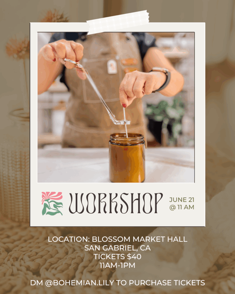 Create your own custom candle at our Candle Crafting Workshop on Saturday, June 21st from 11am – 1pm! DM @bohemian.lily on IG or email bohemianlilyco@gmail.com to book your spot!