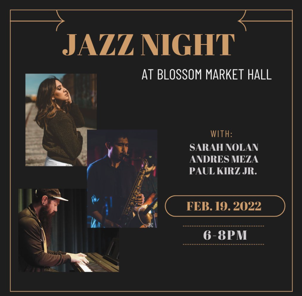 Come enjoy the smooth sounds of jazz by a trio performing on guitar and saxophone with lovely vocals by Sarah Nolan.
