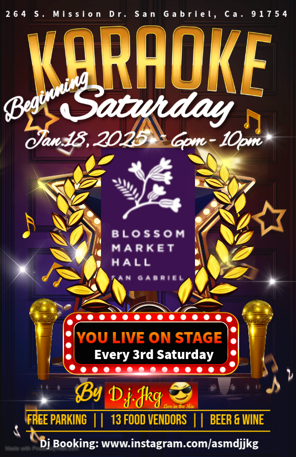 Karaoke Night (hosted by DJ JKG) is back at Blossom Market Hall every third Saturday of the month! Grab your friends and sing your hearts out on March 15th from 6-10pm!