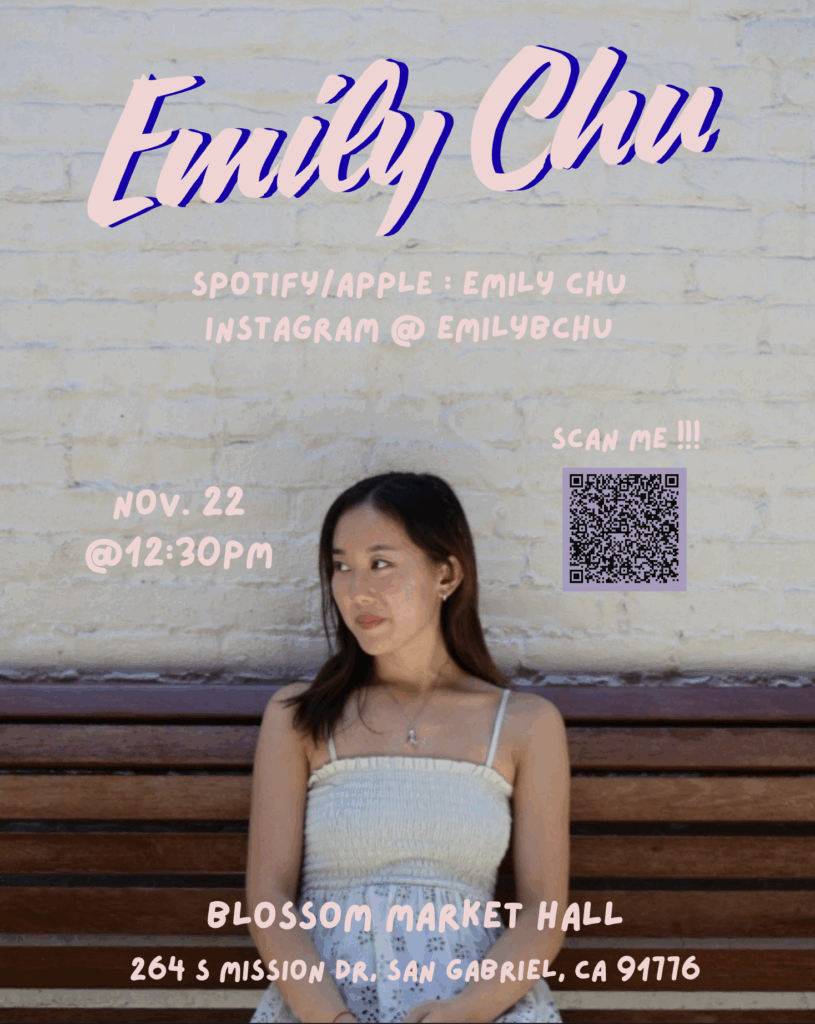 Join Emily Chu, singer-songwriter based in the San Gabriel Valley, for a live performance on Saturday, November 22nd at 12:30pm!