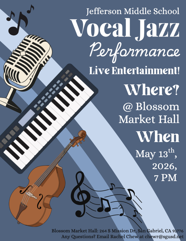 Jefferson Middle School is having a vocal jazz performance at Blossom on Wednesday, May 13th from 7-8pm!