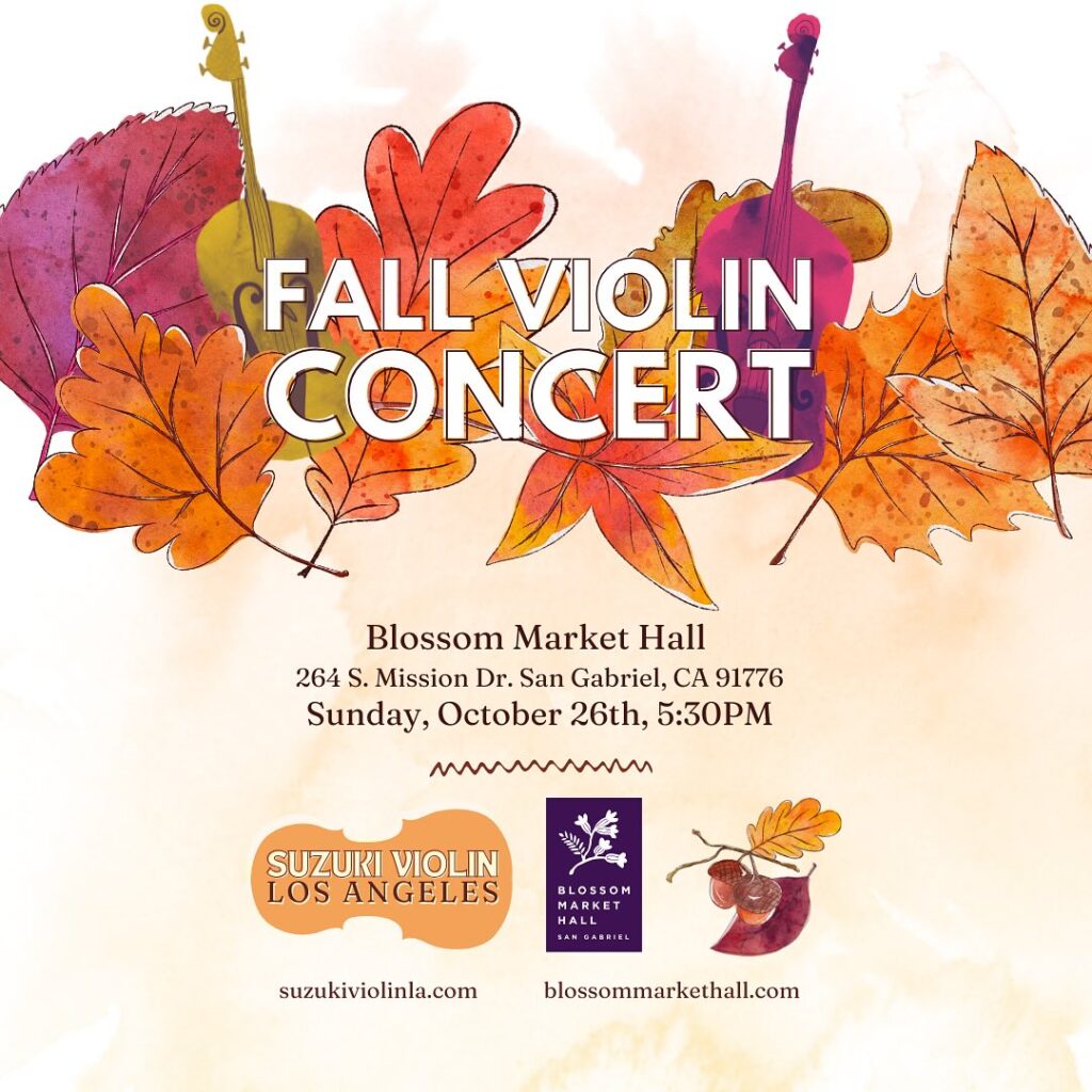 Suzuki Violin will be hosting their Fall Violin Concert at Blossom Market Hall on Sunday, October 26th at 5:30PM. Watch performances from their students from various levels!