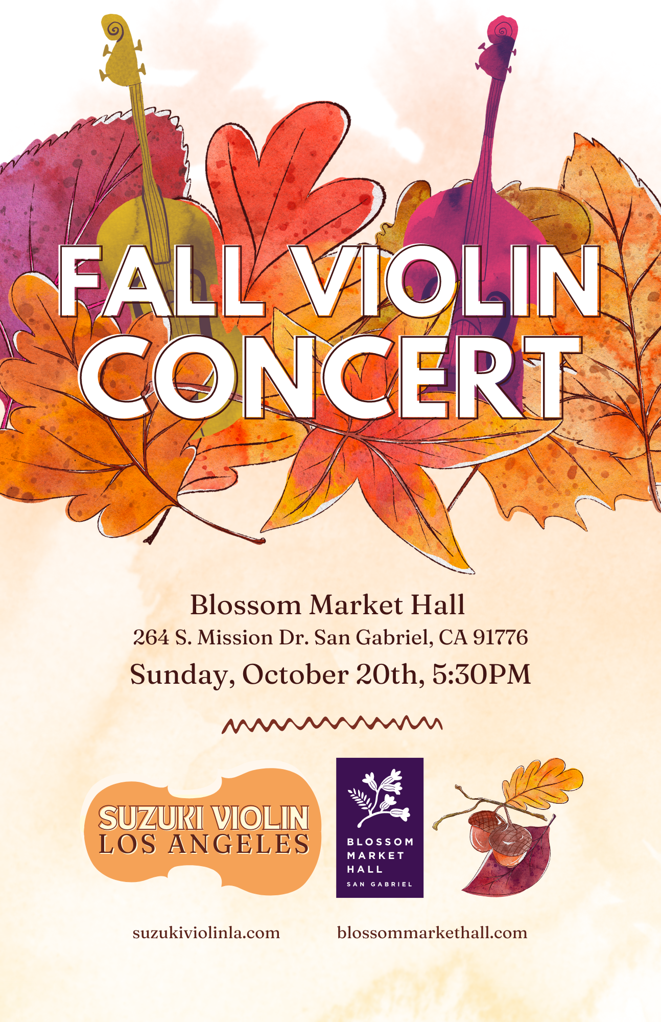 Suzuki Violin will be hosting their Fall Violin Concert at Blossom Market Hall on Sunday, October 20th at 5:30PM. Watch performances from their students from various levels!