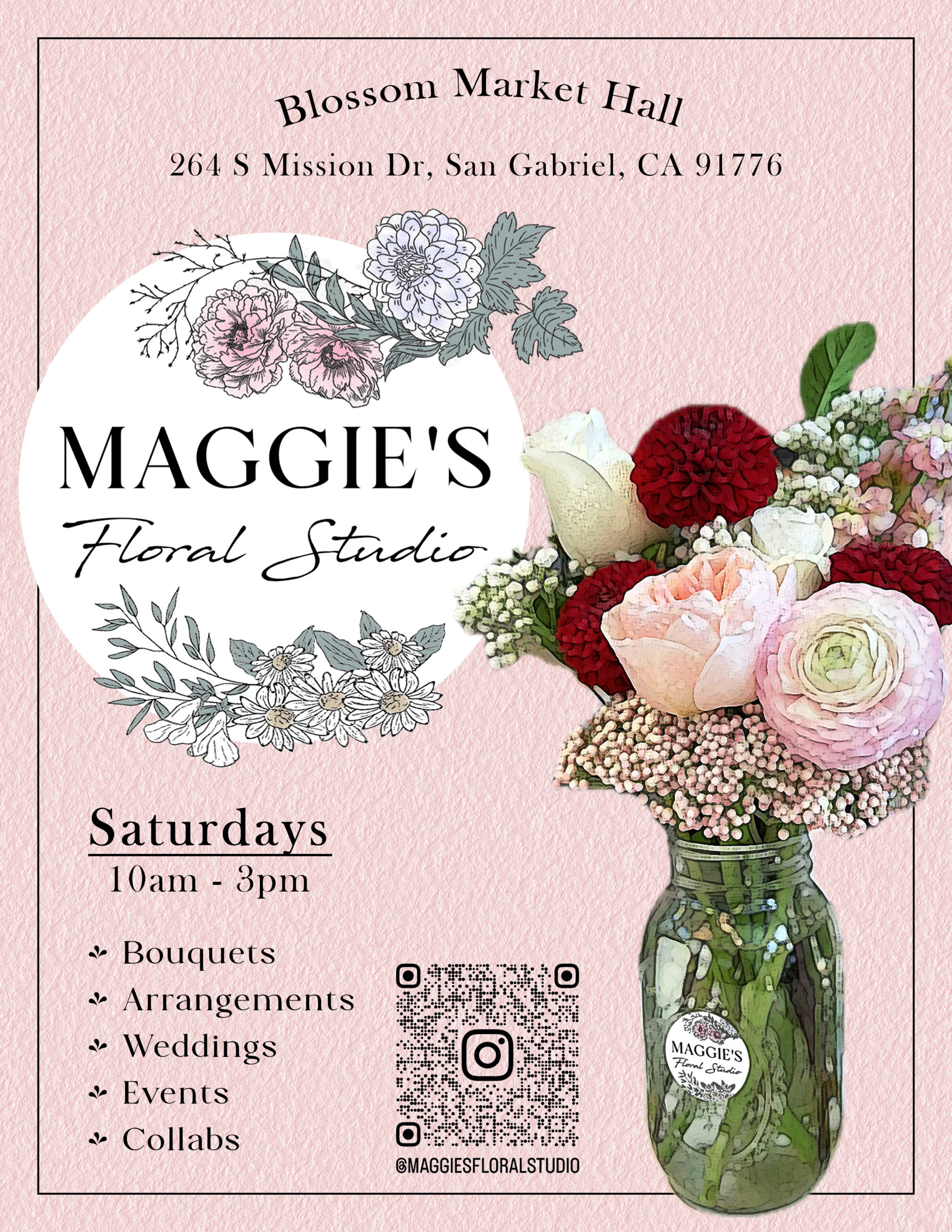 Maggie’s Floral Studio is back. They will be selling floral arrangements and bouquets every Saturday this month!