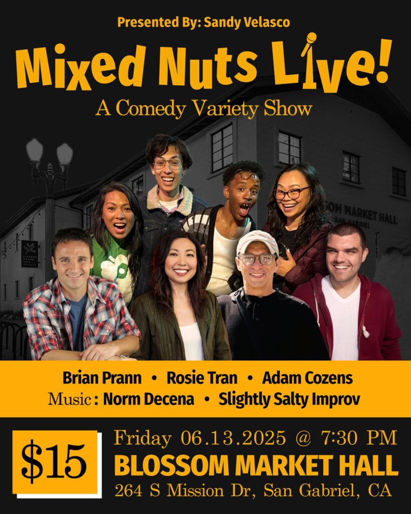 The Mixed Nuts Live! Comedy Variety Show is back! Don’t forget to show your ticket at Bar Blossom for 15% off drinks, at Jasmine Creamery for 10% off, and at Tim’s Thai Tea for 10% off your purchase!