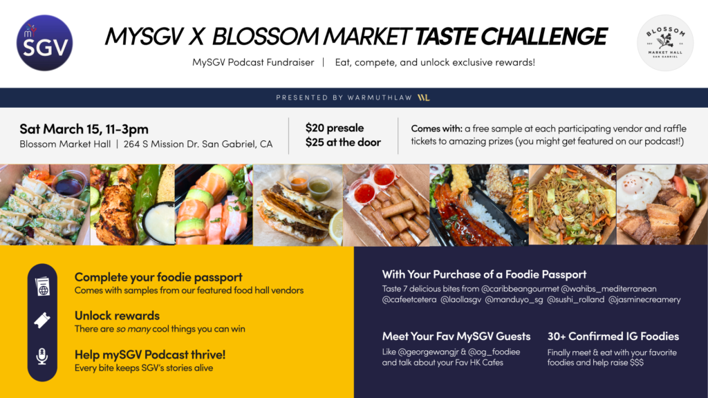 Join us on Saturday, March 15th, from 11 AM to 3 PM for the MySGV Podcast Live Event, a celebration of the SGV’s vibrant food and creator scene! Hosted by comedians George Wang Jr. and Martin Rizo, this event will feature an interactive influencer panel on the main stage and an exclusive upstairs meet-and-greet area for ticket holders to connect with their favorite food influencers. With top local vendors, must-try bites, and some of the biggest foodie names in the game, this is your chance to experience SGV’s food culture like never before!