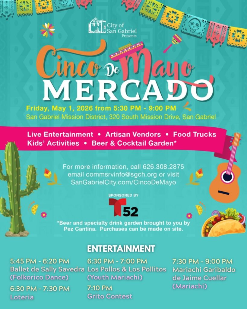The city of San Gabriel is hosting their annual Cinco De Mayo Mercado on Friday May 1st from 5:30-9pm in the Mission District (right outside of Blossom). There will be live entertainment, vendors, food trucks, kids’ activities, and a beer & cocktail garden!