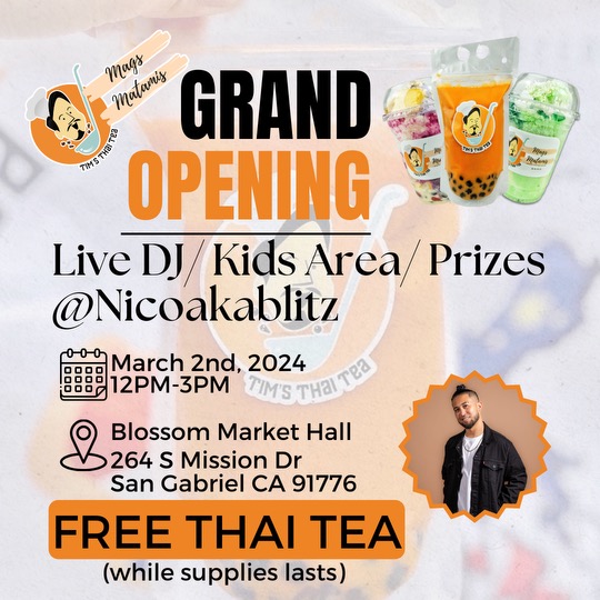 Come join us for the Grand Opening of Tim’s Thai Tea! There will be many exciting and fun festivities to celebrate their Grand Opening from a live DJ & band, to facing painting, balloon art, and more!