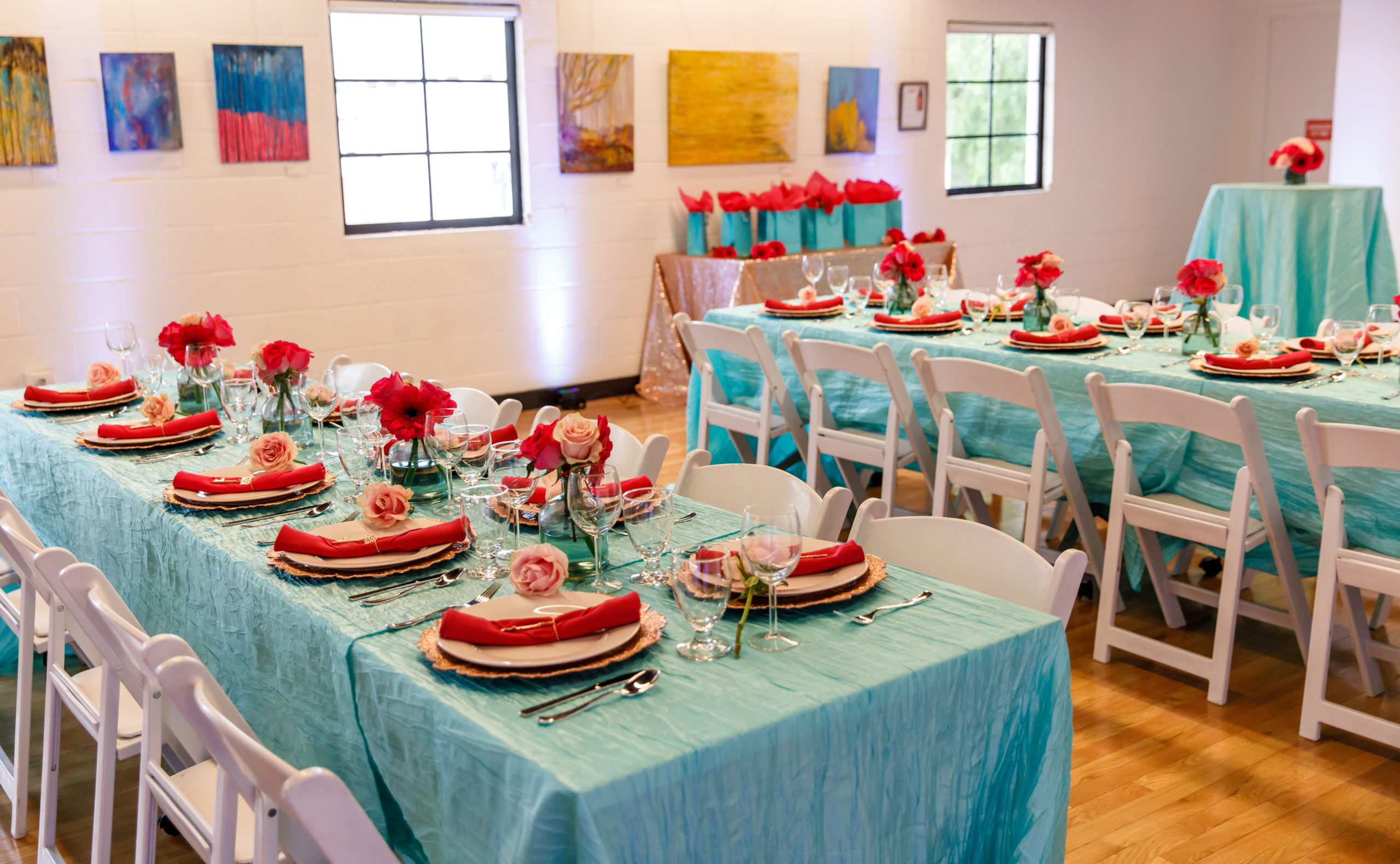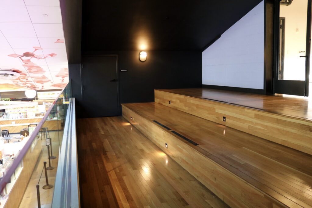 - Available equipment: We can provide up to 8 five-feet long tables, 40 chairs, and a projector and white screen. Renters are welcome to supplement with their own additional tables and seating.